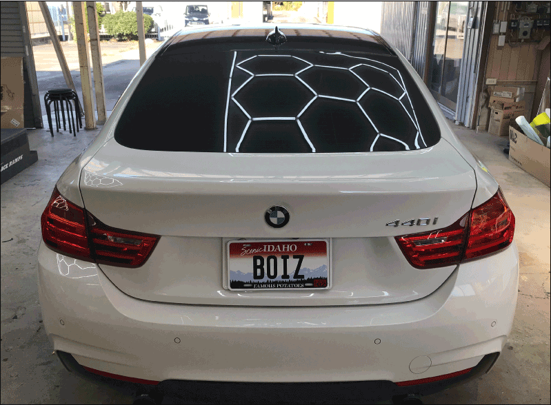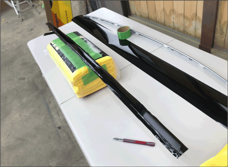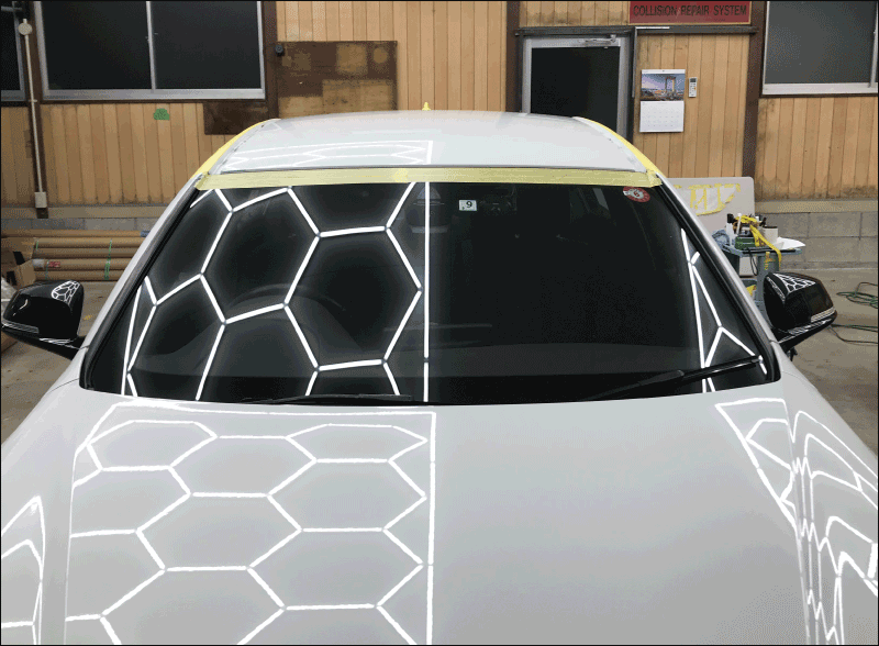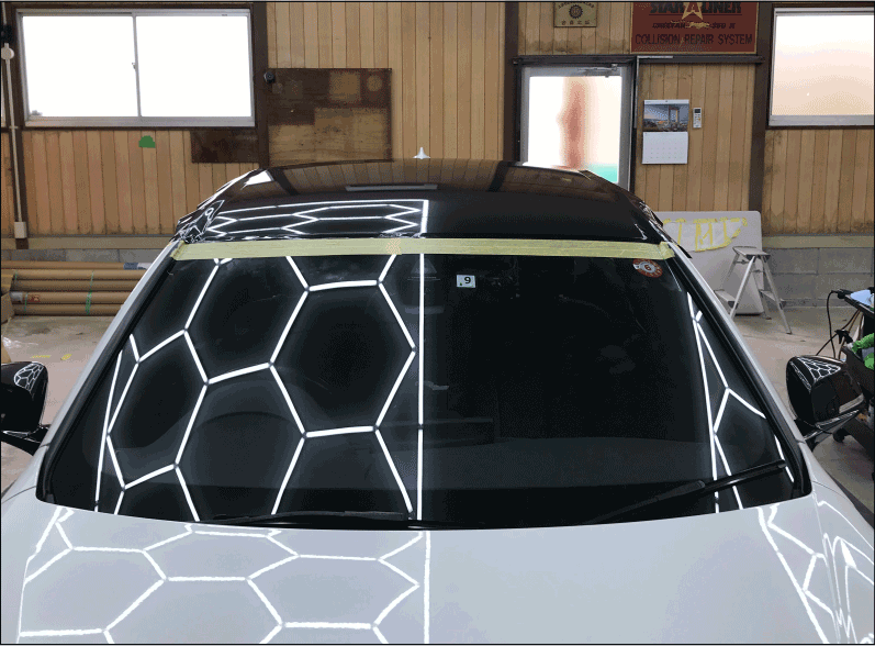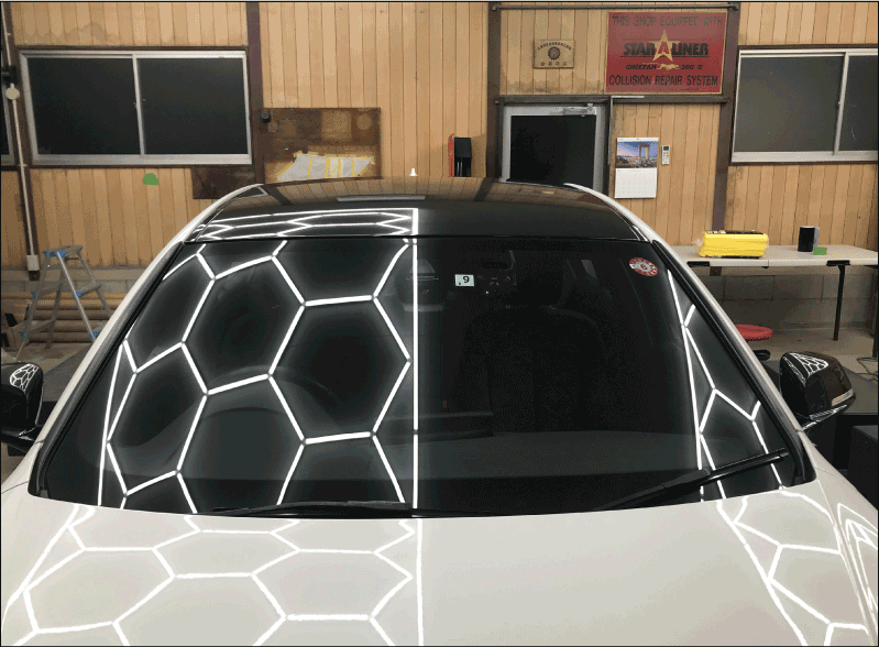 今回はルーフモールもグロスブラックでラッピングします。モールを黒にすることで、フロントガラスとの繋がりが自然に見えるようになります。