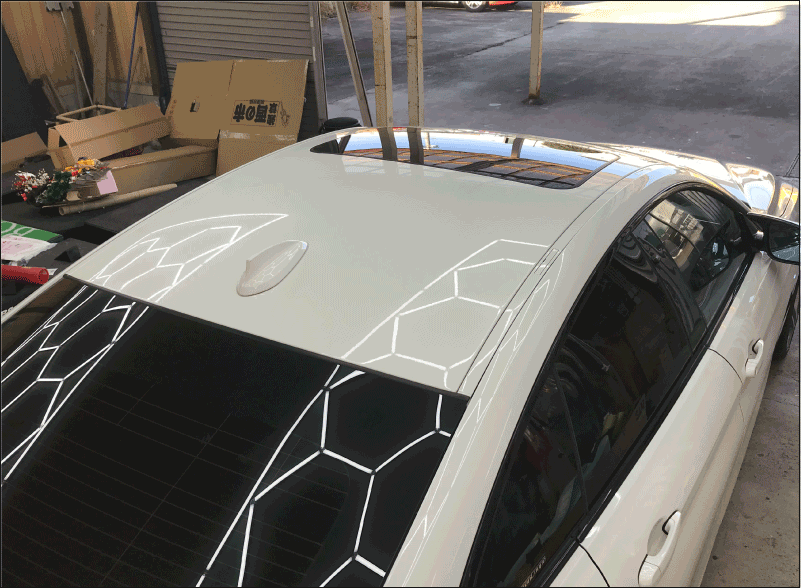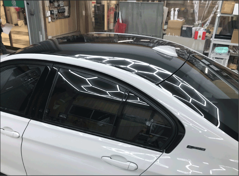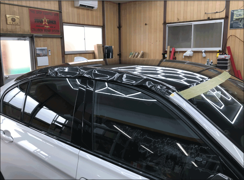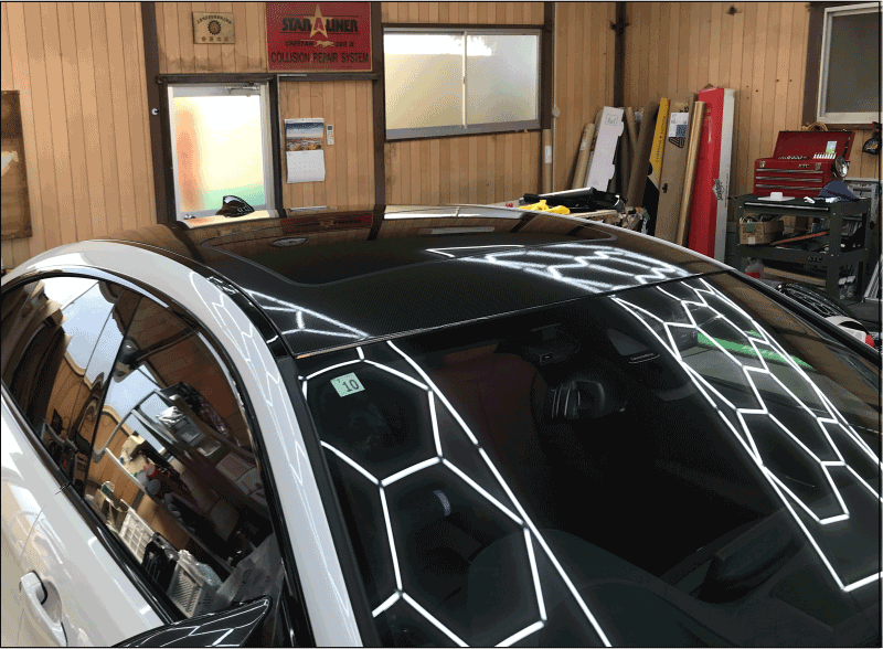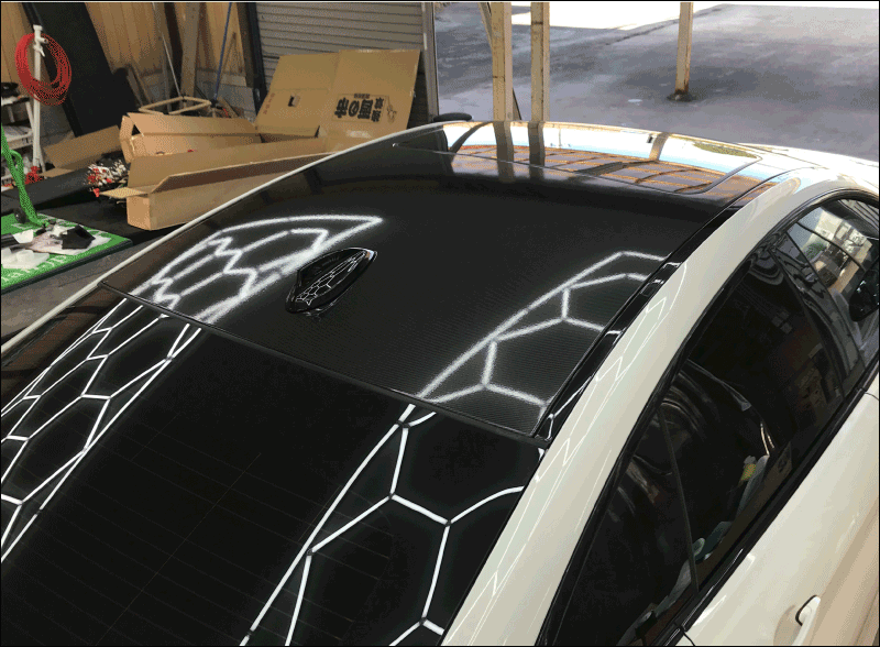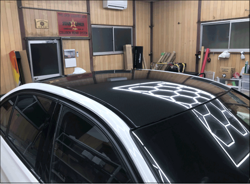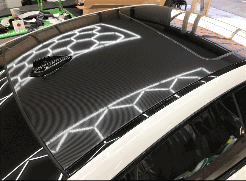 真っ白なルーフにカーボン調のフィルムを施工します。
