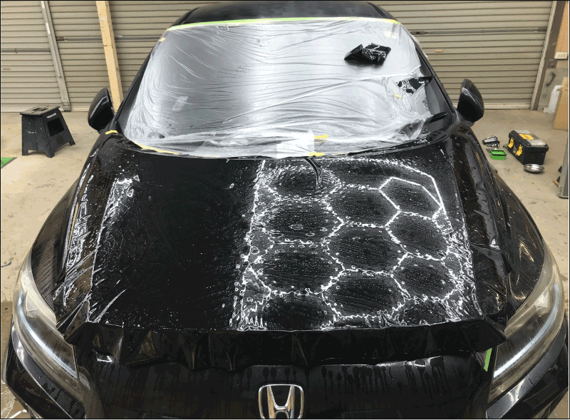 このフィルムのすごいところは、ドライで施工できる点です。施工画像を見てお分かりの通り、PPFは水貼りが基本です。そのため乾燥に時間がかかり、施工液に含まれる気泡が後から出てくる場合もありました。施工液を使わずに施工できるということは、施工にかかる時間が圧倒的に短くなるだけでなく、乾燥後に発生するトラブルも防ぐことができます。講習会で実際に貼ってみた感じも、ラッピングフィルムに近いものがあり、施工性も良い感触でした。