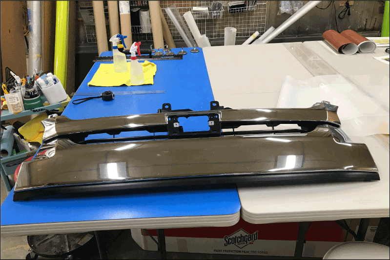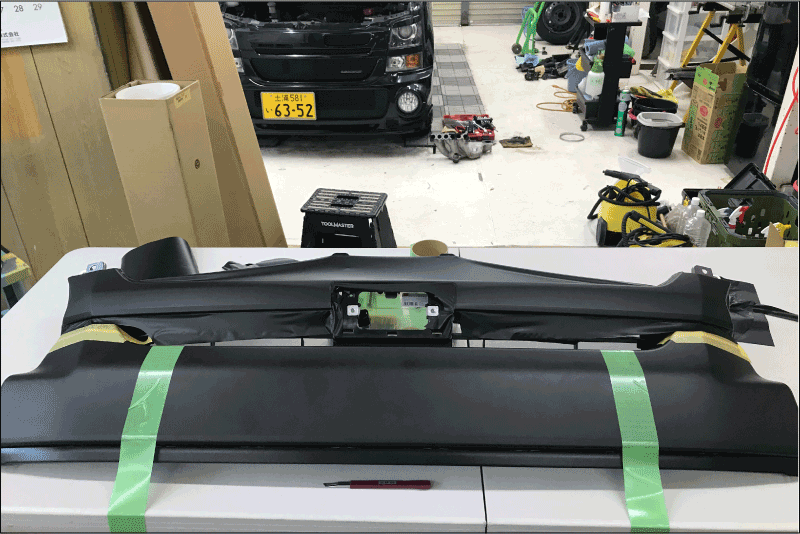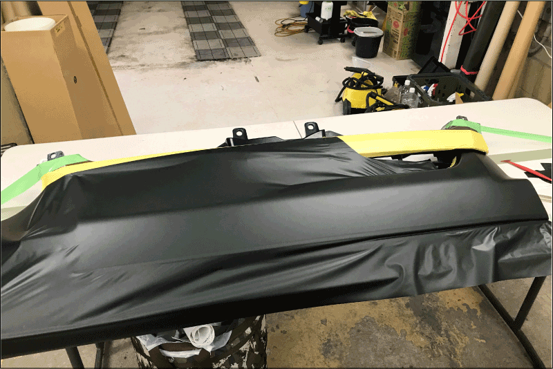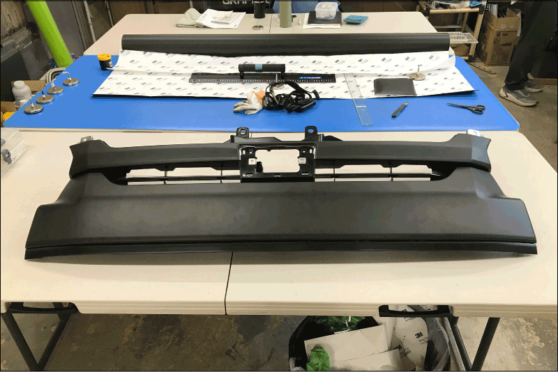 今回は3Mのマットブラックで施工しました。大きめに切ったフィルムをグリルに載せて、熱を加えながら成形していきます。