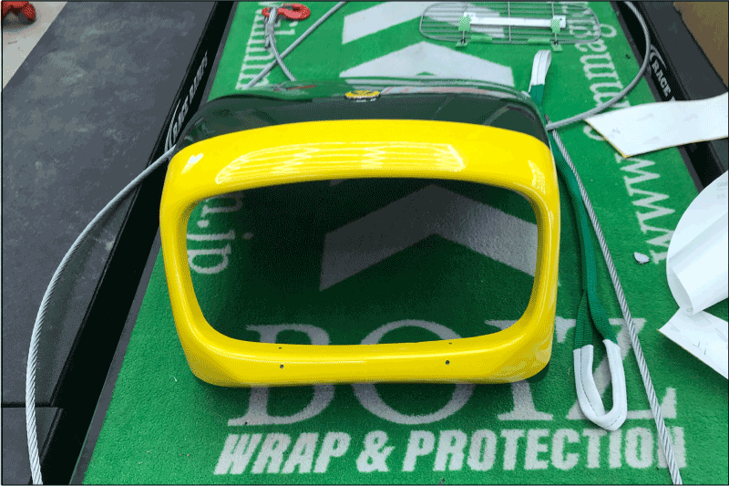 パッと見た感じではそれほど難しくなさそうですが、実はなかなか難しい形状です。僕もYouTubeを見てみましたがノーズバンドを綺麗に施工できた動画はありませんでした。何か難しいかというと、10センチ幅でカウル先端をぐるっとラッピングしようとすると、どうしてもコーナーでフィルムがずれてきます。無理にフィルムを巻きつける様に貼ると、その部分はテンションがかかりすぎて浮いてきます。開口部も深いため、ここも無理に巻き込むと浮き上がりの原因となります。