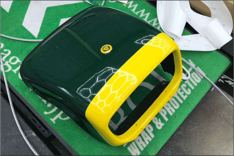 これだけスーパーセブンを愛しておられるオーナー様ですから当然この辺りのカスタムには詳しく、ネットで相当調べられたそうです。塗装も検討したものの、やっぱり後で剥がせるというメリットが気に入り、ラッピングを選択されました。実はご自身でもYouTubeを参考にトライしてみた結果、プロに頼もうということになり弊社にご依頼いただきました。