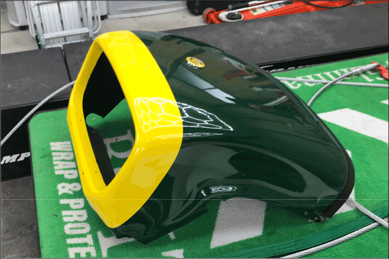 ご依頼の内容はフロントカウルのラッピングです。深いグリーンの塗装色の先端部分にイエローのカラーリングを合わせる作戦です。通称「ノーズバンド」と呼ばれるカスタムなのだそうです。