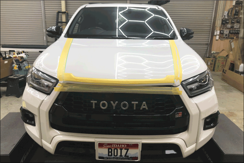 ご依頼内容はボンネットの真ん中の部分だけをマットブラックにしたいとのことでした。ボンネットの左右にあるプレスラインを利用してナイフレステープを仕込んでいきます。